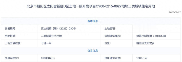 | 交易起始价31亿元,综合楼面价6.13万元/㎡。 受理时间自8月27日起至9月25日下午17:00。